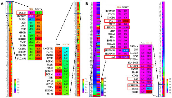 Considering the different origin of array data and the z-score variation between both models within the same gene, the overlapping genes were sorted in an ascending order based on the z-score in the PDX dataset (Figure 6A, left panel), then sorted with the same order, but based on the z-score in the MMTV-PyVT dataset (Figure 6A, right panel). Among the top 15 genes proved common in both models, the comparison analysis revealed DCLK1 as the only downregulated gene with a significant z-score, −2.47-fold and −4.01-fold in MMTV-PyVT and PDX, respectively. Similarly, using the same approach in the topmost upregulated genes, CA3 showed 31.35- and 7.84-fold, SERPINB4 showed 96.65- and 2.98-fold, EFEMP1 showed 14.0- and 2.43-fold, and INMT showed 340.75- and 2.3-fold upregulation in MMTV-PyVT and PDX, respectively (Figure 6B).