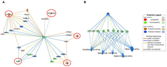 Predicted IPA-generated network mapping of OC-X treatment effects on the signal transduction and molecular interactions of the five topmost affected genes that overlapped in both MMTV-PyVT and PDX array data. (A) Predicted mapping of affected genes was connected based on direct (solid lines) and indirect (dotted lines) interactions with MYC and its intermediate regulators, the best gene linked to the affected genes. The saturation of color is directly proportional to each gene fold change. (B) IPA-generated predicted correlation of MYC-driven genes and TNBC progression stage in response to OC-X treatment.
