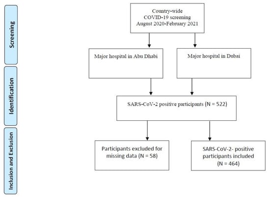 This study was a multicenter observational study with data collected between August 2020 and February 2021. We recruited 522 participants in the UAE who tested positive for SARS-CoV-2 during a COVID-19 screening at either Sheikh Khalifa Medical Centre in Abu Dhabi, or Rashed hospital in Dubai. We obtained written informed consent from all participants. Inclusion criteria were UAE residency and an age of 18 years or older. Blood samples and nasal swabs were collected for examination. Of 522 participants, 58 had missing data for body mass index (BMI; kilograms per square meter of body surface area), so only 464 were included for data analysis. A flow chart for the selection of participants is shown in Figure 1. This study was approved by the Abu Dhabi Health COVID-19 Research Ethics Committee (DOH/DQD/2020/538), the Dubai Scientific Research Ethics Committee (DSREC-04/2020_09), and the SEHA Research Ethics Committee (SEHA-IRB-005).