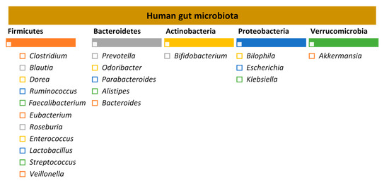 The adult human gut is predominantly colonised by two bacterial phyla, Firmicutes and Bacteroidetes, that comprise over 90% of the total gut microbial communities, followed by other subdominant phyla such as Actinobacteria, Proteobacteria and Verrucomicrobia [7,18] (Figure 1).