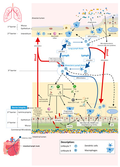 The dynamics and intimate relationship occurring in the lung-gut axis could be partially derived from the fact that both gastrointestinal and respiratory mucosal tracts share the same origin and aspects of physiology and structure, such as the direct contact to the mouth and pharynx. Both have a physical barrier with projections of microvilli (gut) or cilia (respiratory tract) that also participate in conjunction with lymphoid tissues to the local immune system. Besides this, they also share secretory IgA and mucus-producing goblet cells. Indeed, they derive from the same common embryonic organ, the foregut [53,57,58].