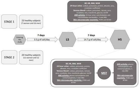 Study timeline and protocol. LS—low salt; HS—high-salt; BP—blood pressure; HR—heart rate; BMI—body mass index; WHR—waist-to-hip ratio; hsCRP—high sensitivity C reactive protein; ANS—autonomic nervous system; HRV—heart rate variability; PORH—post-occlusive reactive hyperemia; AChID—acetylcholine-induced dilation; MST—mental stress test.