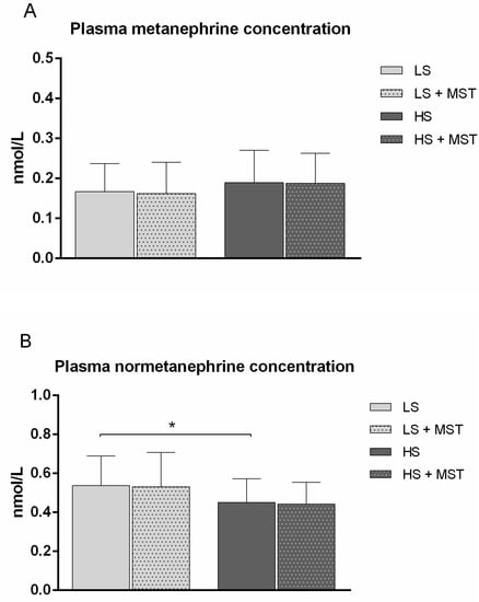 Plasma normetanephrine concentration significantly decreased (Figure 2B), while plasma metanephrine concentration was not significantly changed following 7-day HS diet compared to LS (Figure 2A). MST was not accompanied by significant changes in measured metanephrine and normetanephrine concentration, at both LS and HS diet conditions (Figure 2A,B).