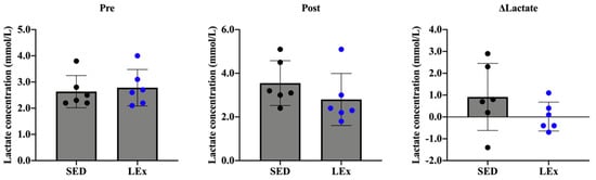 Effects of acute exercise on blood lactate concentrations. The concentration of blood lactate was measured before and after exercise. ΔLactate indicates the change in blood lactate concentrations before and after exercise. SED: sedentary group (n = 6). LEx: low-intensity exercise group (n = 6).