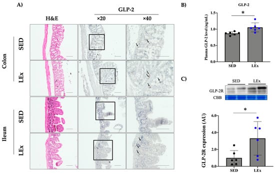 We measured GLP-2 levels in the ileum, colon, and plasma using immunohistochemistry and EIA. In addition, we measured the expression of GLP-2R in jejunal samples. We observed GLP-2 expression in the ileum and colon (Figure 2A). Further, plasma GLP-2 levels were higher in the LEx group (Figure 2B). The jejunal expression of GLP-2R was also upregulated in the LEx group (Figure 2C).