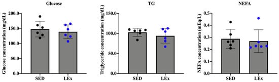 Effects of acute exercise on the concentrations of plasma glucose, TG, and NEFA. TG: triglycerides, NEFA: non-esterified fatty acids, SED: sedentary group (n = 6). LEx: low-intensity exercise group (n = 6).