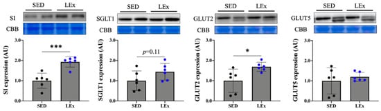 Effects of acute exercise on the expression of proteins related to carbohydrate absorption and digestion. *** p < 0.0005, * p < 0.05. SI: sucrase-isomaltase. SGLT1: Na+-dependent glucose transporter 1. GLUT2: glucose transporter 2. GLUT5: glucose transporter 5. CBB: Coomassie brilliant blue stain. To ensure equal protein loading across lanes, membranes were stained with CBB. The CBB bands represent the 35–48 kDa region where various internal controls are present. SED: sedentary group (n = 6). LEx: low-intensity exercise group (n = 6).