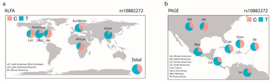 Variations of the allele frequencies of rs10882272. We plotted the allele frequency of each ethnic group (a) Allele Frequency Aggregator (ALFA) and (b) Population Architecture using Genomics and Epidemiology (PAGE). C, rs10882272 C allele; T, rs10882272 T allele.