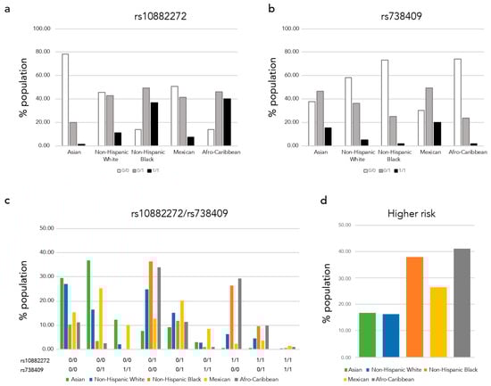 Next, we assessed the combinations of the polymorphisms in each race/ethnic group using TOPMed datasets (Supplementary Table S1). We combined nine case-control and family studies to the analysis, based on the reported race/ethnicity. We excluded cases and individuals with diabetes or hypertension to avoid unknown sampling bias. In total, we included 9081 individuals with 1808 Asian, 1610 non-Hispanic White (European), 1487 non-Hispanic Black (African American), 3656 Mexican and 520 Afro-Caribbean (Latin American, African Caribbean) participants. We plotted the proportions of each polymorphism genotype by race/ethnic group (Figure 2a,b). We observed higher proportions of the homozygous rs10882272 risk alleles (C/C) in non-Hispanic Blacks and Afro-Caribbeans (Figure 2a), and in contrast, Asians and Mexicans had higher proportions of homozygous rs738409 risk alleles (G/G) (Figure 2b). In Figure 2c, we show the proportion of each combination of these two SNPs. The population with low-risk homozygous genotypes (rs738409 C/C and rs10882272 T/T) are high among Asians and non-Hispanic White. While the numbers of individuals homozygous for both risk alleles are small, the highest was Mexican (1.53%) followed by Afro-Caribbeans (0.96%). When we considered at least one of the high-risk allele homozygous as higher risk populations, 37.93% of non-Hispanic Blacks and 40.96% of Afro-Caribbean’s were classified as higher risk populations (Figure 2d).