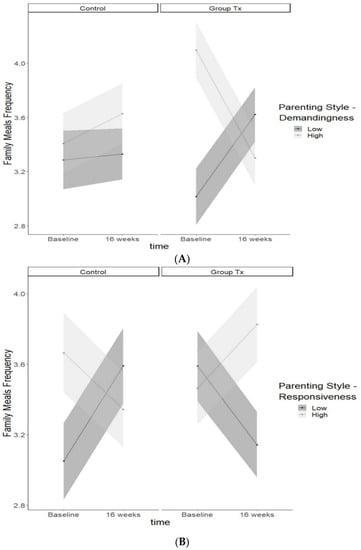 Three-way interaction between time x group treatment x demandingness (A) and time x group treatment x responsiveness (B) predicting frequency of family meals.