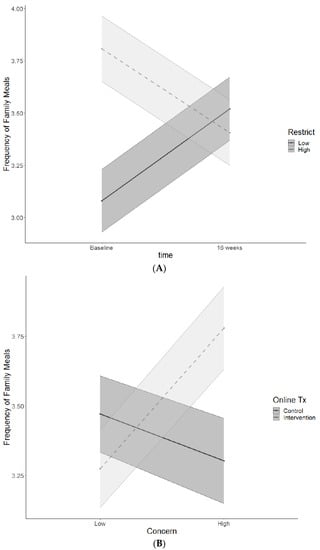 Two-way interactions with parenting feeding practices, including time x restriction (A) and online treatment x concern (B) predicting frequency of family meals.