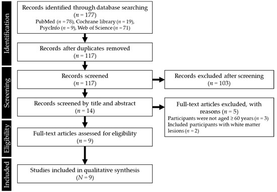 An electronic database search conducted between June and December 2020 resulted in 177 matching abstracts. Many papers reported on the components of carotenoids from the perspective of biochemistry. In addition, many studies on human subjects showed a relationship between carotenoids and cancer or obesity. Most of these papers included the word “t1” in their abstracts. Duplicate exclusions and screening of titles or abstracts identified 14 potentially eligible studies. Of these, five studies were excluded because participants were not aged ≥60 years (n = 3) or because they had white matter lesions (n = 2). The flowchart of study selection is shown in Figure 1.