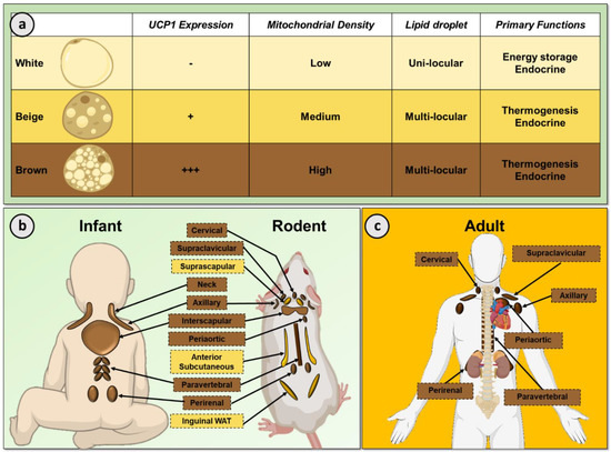 Adipose tissue function and location. (a) Brown adipocytes contain many UCP1 positive mitochondria, numerous small lipid droplets and are involved in thermogenesis. In contrast, white adipocytes contain few mitochondria that do not express UCP1 and a single, large lipid droplet for triglyceride storage. Beige adipocytes have an intermediate phenotype between classic brown and white adipocytes. (b) BAT is primarily located in the interscapular, neck, axillary and perirenal regions (brown boxes) in the human infant, with smaller depots behind the sternum and along the spine (human newborn) [7,8,9]. The size and composition of rodent BAT differs with age, sex and strain with the largest depot in the interscapular region (classical BAT) and smaller depots in the cervical, supraclavicular and peri-aortic regions. Inducible thermogenic beige adipocytes can form in specific WAT depots such as the suprascapular, anterior subcutaneous and inguinal regions (yellow boxes) [10,11]. (c) Adult human BAT is mainly located in the cervical, axillary and supraclavicular regions, with smaller depots observed in the periaortic, perirenal and paravertebral regions. Uncoupling protein 1 (UCP1), brown adipose tissue (BAT), white adipose tissue (WAT).