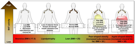 Summary of the impact of undernutrition, overnutrition and altered fat distribution on BAT function. BAT activity is decreased in disorders of both reduced and excessive WAT mass compared with normal weight individuals. Fat distribution may also regulate BAT function, for example central (apple-shaped) obesity may impair BAT activity to a greater extent than those with predominant peripheral (pear-shaped) obesity. In addition, lipodystrophy syndromes are associated with reduced BAT function. Brown adipose tissue (BAT), white adipose tissue (WAT), Body mass index (BMI), waist-hip-ratio (WHR).