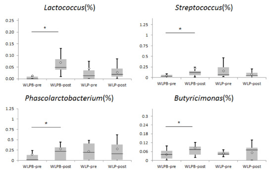 The higher abundance of order Erysipelotrichales was measured within the groups (WLPB-pre vs. WLPB-post; p = 0.001; WLP-pre vs. WLP-post; p = 0.027). Moreover, family Lachnospiraceae decreased in the WLPB group (p = 0.006). It was also numerically decreased in the WLP group; however, the difference was not significant (p = 0.13).