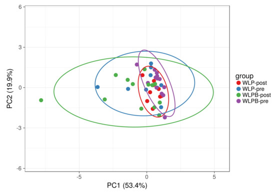 File S2 in Supplementary Materials shows the significant differences in the concentration of certain metabolites after the interventions. In the intra-group comparison, we identified a significant decrease in the lipoprotein fraction Lipo1 between WLPB-pre and WLPB-post (p = 0.036) and WLP-pre and WLP-post (p = 0.026). After the WLPB treatment there was a decrease in the Lipo2 fraction, although it did not reach significance (p = 0.055). Moreover, there was a significant decrease in isoleucine but only in the intra-group WLP. The decrease in isoleucine in the intra-group WLPB was not significant (p = 0.13).