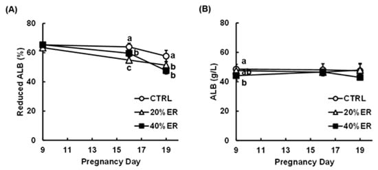 Serum reduced albumin (ALB) ratio and serum ALB concentration in pregnant rats. Serum samples of pregnant rats, obtained on pregnancy day 9 (PD9), 16, and 19, were applied to the analyses of reduced ALB ratio (A) and ALB concentration (B). Data are expressed as means ± SDs (n = 6), which were analyzed by one-way ANOVA followed by a Tukey–Kramer HSD test; at each time point, values with different letters are significantly different (p < 0.05). CTRL, control; 20% ER, 20% energy restriction; 40% ER, 40% energy restriction.