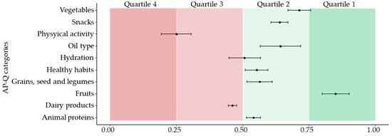 Scores of the AP-Q categories, segmented by quartiles. Data show the median ± standard error of the mean. AP-Q categories range from 0 to 1, being 1 high adherence HFP guidelines.