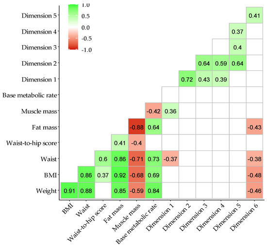 Regarding the relationship between anthropometric parameters and dietary pattern dimensions, dimensions 1 and 6 showed significant correlations. Dimension 1 (energy, water intake, fats, SFAs, MUFAs, PUFAs, cholesterol, carbohydrates, proteins, sodium, and calcium) was positively and significantly correlated with muscle mass (rho = 0.36; p-value = 0.009), and it was negatively correlated with waist circumference (rho = −0.37; p-value = 0.008). Dimension 6 (physical activity, hydration, and animal protein of the AP-Q categories) was significantly and negatively correlated with body mass index (rho = −0.48; p-value = 0.002), fat mass (rho = −0.43; p-value = 0.004), weight (rho = −0.46; p-value = 0.002), and waist circumference (rho = −0.38; p-value = 0.006).