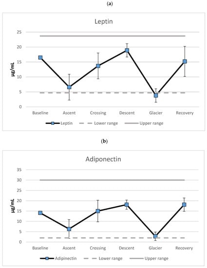- Smith, J.D.; Cianflone, K.; Martin, J.; Poirier, P.; Broderick, T.L.; Noël, M. Plasma Adipokine and Hormone Changes in Mountaineers on Ascent to 5300 Meters. Wilderness Environ. Med. 2011, 22, 107–114. [Google Scholar] [CrossRef]