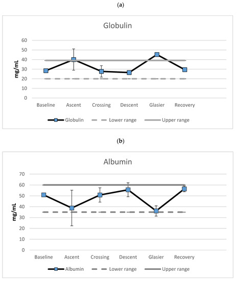 Globulin levels exceeded the upper normal limit during crossing of the Priestly glacier. Furthermore, the globulin levels bordered upper-normal ranges during ascent to the polar plateau. Taken together with the al/gl-ratio, which showed below lower border values while crossing the glacier and abutting of the lower border during ascent, this could be viewed as an indication of malnutrition during these phases. However, the low values swiftly returned to baseline levels amid the expedition, indicating a rapid recovery. Since both extreme physical and psychological stress affect protein synthesis in the liver (albumin and globulin), the muscle to liver, muscle to brain, and brain to liver and adipose tissue pathways need to be further investigated and described.