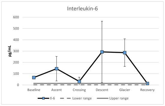 Mean level of Interleukin-6 (ρg/mL), separated for the different phases during the expedition. Error bars represent standard deviations.