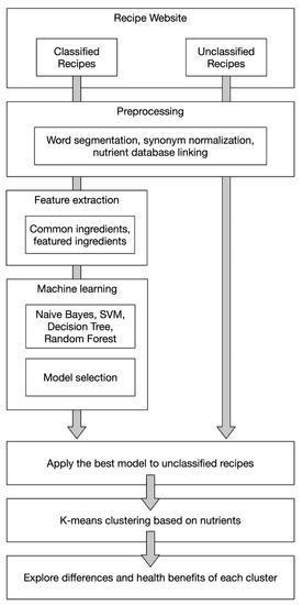 Our study relies on the recipes data retrieved from iCook.tw, the largest Chinese recipe-sharing website in Taiwan. After data collection and preprocessing, ingredients and nutrients are regarded as features and machine learning as well as data exploration techniques are utilized to analyze cuisine types, dietary habits and its influences on health. The entire process of our system is presented in Figure 1. Major components of our method include: (1) preprocess the free-form recipes collected from the Internet, (2) train machine learning models to extract key features as well as help categorize these recipes by their nutritional content, and (3) uncover relationships between food, nutrients, and health. Detailed experimental methods are revealed in the following sections.