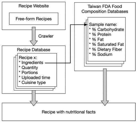 For the nutritional content, due to the fact that the website does not have nutritional labels, we attempt to map the ingredients to the 2017 version of the Taiwan FDA Food Composition Databases (TFDA) for gaining nutritional insights. This process is illustrated in Figure 2. The application of such a database can effectively convert free-form data into meaningful and structured information.