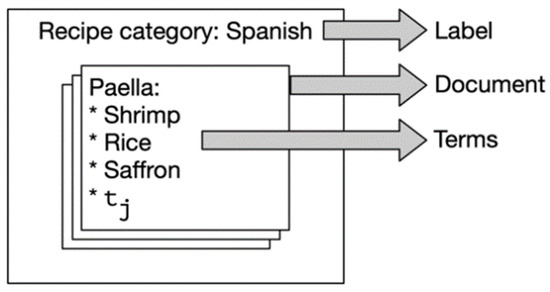 This step is to identify common and featured ingredients, in other words, those that appear across multiple types and only in a few types. To achieve this, each recipe is considered as a document, while each ingredient is considered as a term and each cuisine type is considered as a label, as illustrated by Figure 3. Term Frequency—Inverse Document Frequency (tf-idf) (https://en.wikipedia.org/wiki/Tf%E2%80%93idf (accessed on 22 May 2021).) is used for calculating a vector representation of the ingredients. Then, we experiment with four widely used machine learning models, including naïve Bayes (NB) [26], decision tree (DT) [27], random forest (RF) [28], and support vector machine (SVM) [29], to construct our classifier.
