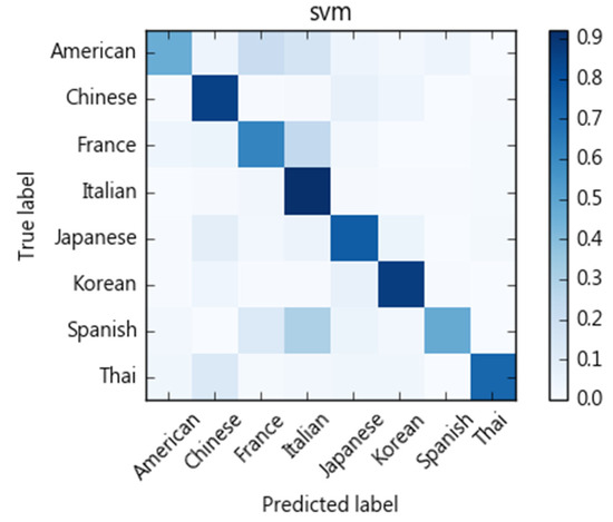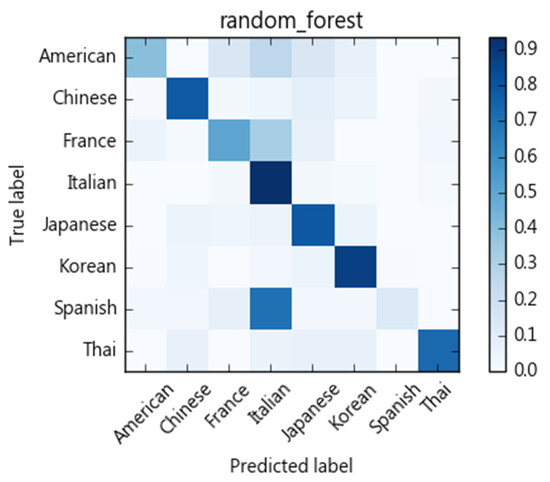 Figure 5, Figure 6, Figure 7 and Figure 8 show the confusion matrices corresponding to SVM, naïve Bayes, decision tree, and random forest classifiers in this study. Compared to other cuisines, Chinese, Italian, Korean, Thai, and Japanese cuisines are easy to distinguish from one another, whereas French, American, and Spanish cuisines are more challenging. Taking the confusion matrix of the SVM model as an example, we can further find that American, French, and Spanish recipes tend to be classified as Italian cuisine. Table 12 lists some American, French, and Spanish recipes that are classified as Italian and their ingredients. We note that some ingredients have higher Specialty scores in Italian cuisine, but the misclassified recipes have low Specialty scores on those ingredients, which may be the reason for the misclassification of these dishes. For example, American recipes classified as Italian cuisine mostly contain olive oil, while French recipes include tomatoes, spaghetti and other ingredients, and Spanish recipes include basil, tomatoes, and cream. Similarly, Thai and Japanese dishes are sometimes classified as Chinese dishes. As indicated in Table 13, soy sauce, white pepper, rice wine, and shiitake mushrooms are also quite common ingredients in Chinese cuisine.