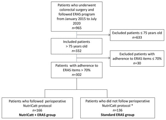 Between January 2015 and July 2020, 965 patients underwent colorectal surgery. Of a total of 332 patients >75 years of age, 302 patients met the inclusion criteria and were retrospectively included. Of these, 166 (55%) underwent NutriCatt protocol within the ERAS program, while 136 patients (45%) followed the standard ERAS program for several reasons: failure to undergo a pre-hospitalization nutritional check, fast-track regimen, emergency intervention. Figure 1 illustrated the flowchart of the study.