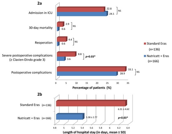 In this study, a higher ASA score was shown to be associated with a longer LOS. These findings are consistent with the existing literature. Indeed, the correlation of ASA scores with operating times, LOS, postoperative infection rates, overall morbidity, and mortality rates has been demonstrated in patients with adenocarcinoma of the gastroesophageal junction [], in gynecological surgery patients [], and in patients undergoing elective colorectal resection []. Surprisingly, in our study, the rate of ASA score ≥3 was significantly greater in the NutriCatt + ERAS cohort. This could probably explain the lack of association between NutriCatt protocol and LOS at the multiple regression analysis. Another hypothesis could be the already short LOS (mean 5.81 days) in the entire population due to the application of ERAS protocol.