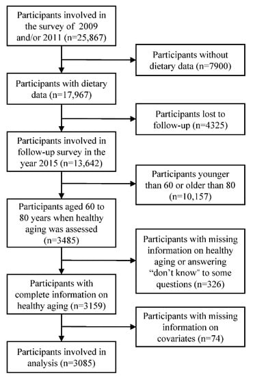 The present study utilized data collected in the China Health and Nutrition Survey (CHNS). The CHNS was a dynamic cohort study. The participants came from twelve geographically diverse areas of China. The first wave of the survey was initiated in 1989, and the last survey—which is open access—was conducted in 2015. Details about the CHNS have previously been published []. Prospective data collected in the years 2009, 2011, and 2015 were used in the present study. Baseline information was collected in the years 2009 and 2011, and outcomes (healthy aging) were assessed in the year 2015. The inclusion criteria of the present study included being involved in the year 2009 and/or 2011, involved in the year 2015, and aged 60 to 80 years in the year 2015. The exclusion criteria were having missing information on covariates, being absent from the dietary survey, having missing information on healthy aging indices, answering “don’t know” to any questions concerning physical functional limitation and comorbidity, and answering “don’t know” to all questions concerning psychological stress. Finally, 3085 participants were included in the analysis (Figure 1).