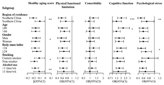 Subgroup analysis of the association between dietary diversity score tertiles and healthy aging. Dietary diversity scores were grouped into tertiles from low to high (T1: 1.7–3.3, T2: 3.5–4.3, and T3: 4.4–8.0). Squares and horizontal lines showed the results of T3 vs. T1. * p < 0.05, ** p < 0.01, *** p < 0.001. OR, odds ratio; CI, confidence interval. Association of DDS tertiles with healthy aging score (lower score indicated healthier aging) was estimated by a linear regression model. Association of DDS tertiles with physical functional limitation, comorbidity, cognitive function, and psychological stress was estimated by an ordinal logistic regression model. Comorbidity and physical functional limitations were classified into categorical variables according to the number of comorbidities or functional limitations (0, 1–2, or ≥3). Cognition and PSS were grouped into tertiles from low to high. Multivariate models were adjusted for age, gender, region of residence, residency, education, income, marriage status, body mass index, smoking, and alcohol use. Analyses within subgroups were adjusted for all other covariates.