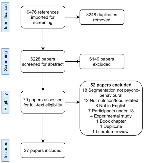 Jenkins, E.L.; Legrand, S.; Brennan, L.; Molenaar, A.; Reid, M.; McCaffrey, T.A. Psycho-Behavioural Segmentation in Food and Nutrition: A Systematic Scoping Review of the Literature. Nutrients 2021, 13, 1795. https://doi.org/10.3390/nu13061795