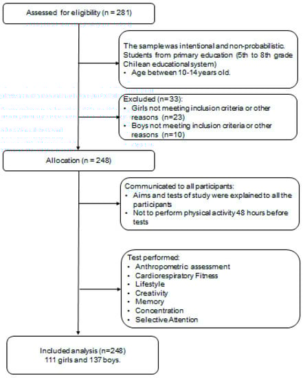 Children’s lifestyle (i.e., diet, PA, etc.) has commonly been studied in the context of health [22]. However, it is reasonable to expect that lifestyle factors are intertwined with cognition and learning processes in children [23]. For example, Kim et al. reported a positive association between school performance and dietary habits [24]. Healthy diet habits (i.e., breakfast consumption), for example, may improve cognitive function and test grades [25]. However, little is known regarding the associations of nutrition with components of executive function in adolescence [26], especially among Chilean schoolchildren. It is important to consider that a Chilean national study of physical education focused on physical condition and anthropometric parameters showed that 70% of students need to improve their CRF [27]. Additionally, in Chile, a high prevalence of children with overweight and obesity have been reported (approximately 44% of students at the age of 13 years old) [28]. Therefore, it is considered a public health problem [22]. In this line, it is important to evaluate the association between CFR and nutritional status with executive function, particularly in Chilean schoolchildren. Likewise, to the best of our knowledge, no other study has explored the association of creativity and memory with CRF, lifestyle, and anthropometric parameters in Chilean schoolchildren. The objective of the present study was to determine the association between creativity and memory with CRF (i.e., CFR classification and O2max), lifestyle parameters (i.e., PA, screen time, sleep duration, and food habits), and anthropometric measures (i.e., body mass index and waist circumference) among Chilean schoolchildren. A secondary aim was to compare creativity, memory, concentration, and selective attention according to CRF levels (i.e., high and low) and nutritional status.