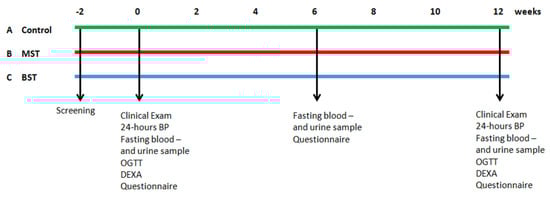 The study design. The far left shows the three groups in the top (A) the control group (green); (B) mild and sweet tasting (red); and finally (C) bitter and strong tasting (blue). Screening took place approximately 2 weeks prior to project start. At weeks 0 and 12, fasting blood and urine samples were taken, 24 h blood pressure (BP) and oral glucose tolerance test (OGTT) were performed, and DEXA scans were conducted. At weeks 0, 6, and 12, participants filled out thorough questionnaires. Randomization took place at week 0.