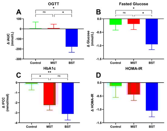 After the 12-week intervention period, changes in iAUCglucose 240 min (OGTT), fasting glucose levels, HbA1c, and HOMA-IR are shown in Figure 3. Regarding improvements in iAUCglucose 240 min (OGTT) (Figure 3A), we observed a significant reduction in iAUC for the BST group of −177.4 ± 55.62 mmol/L compared to CON and MST intervention (p < 0.05 respectively). The iAUC for the CON and MST group did not significantly change from baseline (Figure 4). The BST intervention also significantly lowered fasted glucose (−0.95 ± 0.20 mmol/L) compared to MST and CON groups (p < 0.05, respectively), while MST and CON groups remained unchanged from baseline (Figure 3B). In addition, HbA1c (Figure 3C) decreased in both the BST (−3.1 ± 0.61 mmol/L) group and in the MST of (2.25 ± 0.49 mmol/L) group compared to the control group (p < 0.01 and p < 0.05, respectively), which was unchanged from baseline. There was no significant difference between BST and MST groups in the reduction of HbA1c. Furthermore, there was no significant difference in change in HOMA-IR between the three groups (Figure 3D), although the intragroup change in HOMA-IR for the BST declined significantly (p < 0.0001, Table 3) The goal of maintaining the control group in their current health status was achieved, as no intra-group changes were seen after the intervention in any of the above-mentioned categories. Changes in fasting insulin and glucagon levels as well as AUC insulin 240 min and AUC glucagon 240 min from the OGTT are shown in Table 3. Fasting insulin levels did significantly decline within the BST (p < 0.05) and MST group (p < 0.01), but no changes were found between the groups. No significant changes were observed concerning glucagon levels, and no significant changes were observed in AUC insulin 240 and AUC glucagon 240 min from the OGTT. HOMA-IR did not change between the groups, but a significant intragroup decline was found in the BST group (p < 0.0001) and a tendency for reduction in the MST group (p = 0.055). There were no registered changes to participants’ medicine usage during the study.