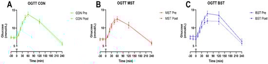 OGTT before and after 12-weeks of intervention. (A) CON, (B) MST, (C) BST. Data are presented as mean (±SEM). Significance testing was performed on between group differences in change in iAUC OGTT glucose (please see Figure 3A).