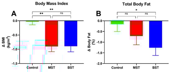 We observed significant changes concerning the body composition in the BST and MST groups compared to control (Table 4). There were no significant intragroup changes in body composition in the control group. Both BST and MST groups had a significant decline in BMI (Figure 5) compared to control (p < 0.01 respectively) and weight (p < 0.01 and p < 0.001, respectively). No significant difference was found between the groups in waist circumference, and only the BST group had a significant reduction in total body fat mass compared to control (p < 0.01).