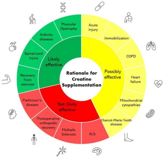 Creatine has gained popularity as a dietary supplement because of its fundamental role in human health and physical performance. Its metabolic contributions are many and wide ranging, and it is one of the most frequently used and effective supplements available for health and performance []. Various research studies over the last several decades have shown that creatine supplementation has numerous positive effects on skeletal muscle structure and metabolism, including improving training volume and muscle mass (growth/hypertrophy) in conjunction with exercise []. Therefore, the potential of creatine to augment training-induced muscle hypertrophy is not only relevant in the context of elite sports performance but also in the context of rehabilitation of various conditions due to its ability to prevent muscle atrophy []. While its role as an ergogenic agent in sports is well supported by several studies [], there is growing research interest from the medical field regarding the potential for creatine to serve as a therapeutic agent in a wide range of conditions [,]. Figure 1 provides an overview of the therapeutic efficacy of creatine supplementation in a variety of conditions examined within this review. Interestingly, Corn and colleagues [] have suggested that creatine may be beneficial as an adjunct to traditional physical therapy interventions. Therefore, the purpose of this review is to examine the literature concerning the effectiveness of creatine monohydrate supplementation as a potential strategy to enhance the rehabilitation of muscle and function in physical inactivity (disuse) and disease-related conditions.