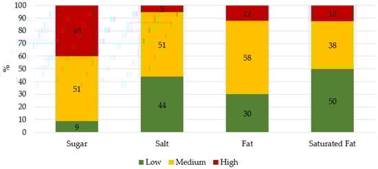 Categorization of sugar, salt, fat, and saturated fat levels according to the nutritional traffic light system. Levels for each nutrient (g/100 g product): sugar (low < 5, medium 5–22.5, high > 22.5); salt (low < 0.3, medium 0.3–1.5, high > 1.5); fat (low < 3, medium 3–17.5, high > 17.5) and saturated fat (low < 1.5, medium 1.5–5, high > 5) [39,40].