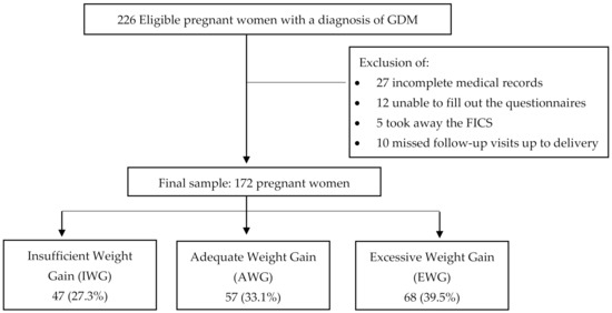 A total of 226 women with a single pregnancy and a GDM diagnosis was recruited between May 2017 and October 2018. As shown in Figure 1, fifty-four women were excluded. The remaining 172 were divided into three groups, according to their adequacy of weight gain during pregnancy (calculated from their pregestational BMI), as recommended by the IOM [14]. The three categories were the following: IWG, 47 (27.3%); AWG, 57 (33.1%); and EWG, 68 (39.5%).