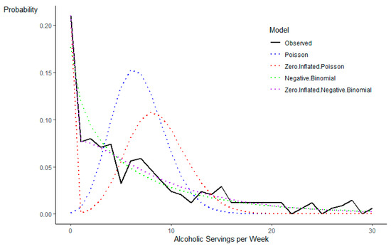 Regression models were used to examine the associations between demographic characteristics, golf participation, golf participation plus golf motives, weekly walking duration (hours/week), weekly MVPA duration (hours/week), total PA volume (MET hours/week), and alcohol servings/week. In the first step of the analysis, we estimated a series of intercept-only models of alcohol servings/week to determine the best fitting model. The models tested included Gaussian, Poisson, negative binomial, zero-inflated Poisson (ZIP), and zero-inflated negative binomial (ZINB) [39,40]. Akaike information criterion (AIC) and Bayesian information criterion (BIC) values, the log-likelihood ratio test (LRT, for nested models), and the Vuong test (for non-nested models) were used to determine the model of best fit [40,41,42].