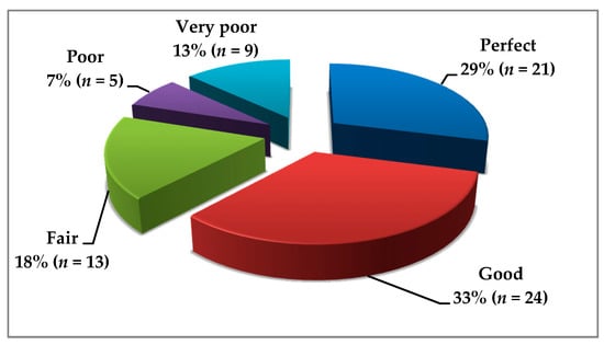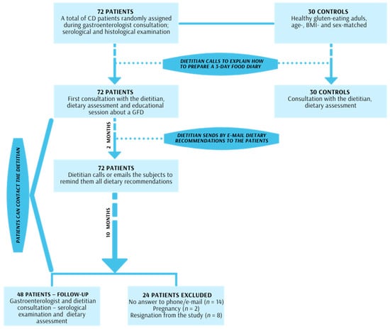 The study was conducted from October 2015 to April 2018 and involved 72 adults (63 women and 9 men) with a diagnosis of CD who were outpatients under the care of the Department of Gastroenterology and Hepatology at the Medical University of Gdansk. They were randomly recruited by a gastroenterologist during a routine consultation and had to meet the following inclusion criteria: be on a GFD, be over 18 years of age and have a diagnosis of CD based on serological and histological tests according to the British Society of Gastroenterology guidelines []. The exclusion criteria were being under 18 years, not giving consent to take part in the study, being pregnancy and not having a clear diagnosis of CD. Based on the patients’ anamneses, the other most common autoimmune disease was hypothyroidism (15% of participants). A positive result for anti-endomysial antibodies (EMA) and anti-tissue transglutaminase (tTG) IgA together with a biopsy result were adopted as indicators of active disease. In the end, the study group consisted of 26 subjects with active CD and 46 with CD in remission.
