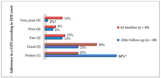 The adherence to a GFD assessed by the Standardized Dietitian Evaluation (SDE) in follow-up CD patients (n = 48) before and one year after education. * Differences were statistically significant (p < 0.05).