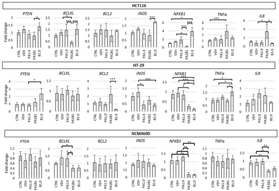 Impact of 1 mM butyrate (B1.0), 1 mM phytate (PA1.0) and their combination (PA1B1) on the expression of PTEN (phosphatase and tensin homolog), BCLXL (B-cell lymphoma—long isoform (Bcl-xL)), BCL2 (B-cell lymphoma protein 2), iNOS (inducible nitric oxide synthase), NFΚB1 (nuclear factor kappa B p105 subunit), TNFα (tumor necrosis factor alpha), and IL8 (interleukin 8) genes in HT116, HT-29, and NCM460D cells. The values are significantly different at p < 0.05, p < 0.01, and p < 0.001 are marked with *, **, and ***, respectively.
