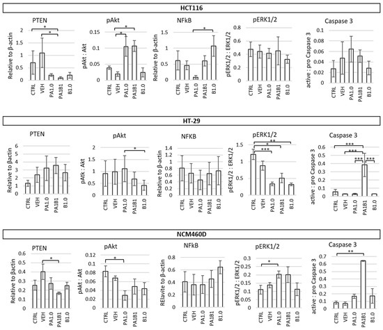 Impact of 1 mM of phytate (PA1.0) and 1 mM of butyrate (B1.0) applied alone or in combination (PA1B1) on the level of cellular proteins or their phosphorylation. PTEN (phosphatase and tensin homolog), pAkt (ratio of phosphorylated to unphosphorylated form of Akt), NFκB (nuclear factor kappa B p65), pERK1/2 (ratio of phosphorylated to unphosphorylated form of ERK1/2), active caspase 3 (ratio of active form of caspase 3 to pro-caspase 3) in HT116, HT-29, and NCM460D cells. The values are significantly different at p < 0.05, p < 0.01, and p < 0.001 are marked with *, ** and ***, respectively.