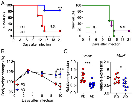 To assess the impact of diets on lethal infectious diarrhea, AD, FD, PD, and RD-fed mice were infected with C. rodentium, and their survival was monitored over time. More than 90% of RD, PD, and FD-fed mice succumbed to infection, compared to only 20% of AD-fed mice (Figure 1A). Since only the protein sources of the PD and AD differed (casein vs. amino acids), we next focused on PD and AD-fed mice. Body weight loss was significantly greater in PD-fed mice than in AD-fed mice throughout the duration of infection (Figure 1B). Wnt signaling activation is one of the hallmarks of diarrheal C. rodentium infection susceptibility [37]. Therefore, we compared the expressions of β-catenin (Ctnnb1), the principal canonical Wnt signaling downstream mediator, and MMP-7 (Mmp7), which is transcriptionally regulated by β-catenin. The expression of Wnt target genes Ctnnb1 and Mmp7 was significantly lower in the AD-fed mice colon than that in PD-fed mice colon (Figure 1C). These results indicate that an AD protects mice from lethal C. rodentium infection.