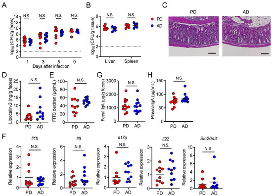 Next, we examined whether an AD influences pathogen clearance and gut barrier function. Fecal C. rodentium shedding was detected as early as 1 day post-infection and was not significantly different between PD and AD-fed mice 9 days post-infection (Figure 2A). The bacterial burden in the liver and spleen of PD and AD-fed mice was also similar (Figure 2B). After the C. rodentium infection, severe epithelial hyperplasia and a loss of crypt morphology were observed, but the histological changes of the colon were not apparently different between the mice fed a PD and AD (Figure 2C). Consistently, the fecal level of lipocalin-2, an inflammatory marker, was comparable in both groups 9 days post-infection (Figure 2D). We then assessed the intestinal barrier function in PD and AD-fed mice by measuring the plasma level of the orally administered permeability marker FITC-dextran. The plasma level of FITC-dextran was not different between the groups 7 days post-infection (Figure 2E). In addition, the colonic expression of inflammatory cytokines, Il1b, Il6, Il17a, Il22, and Slc26a3, which encode the major Cl−/HCO3− exchanger that drives water absorption [38], was comparable between the infected mice fed a PD and AD (Figure 2F). Furthermore, the levels of fecal (intestinal) IgA, which prevents enteric pathogen invasion [39], and plasma IgA, which protects against polymicrobial sepsis [40], were not significantly different between PD and AD-fed mice prior to the infection (Figure 2G,H). Collectively, we concluded that an AD neither promotes pathogen elimination nor suppresses C. rodentium-induced intestinal damage, inflammation, and sepsis.